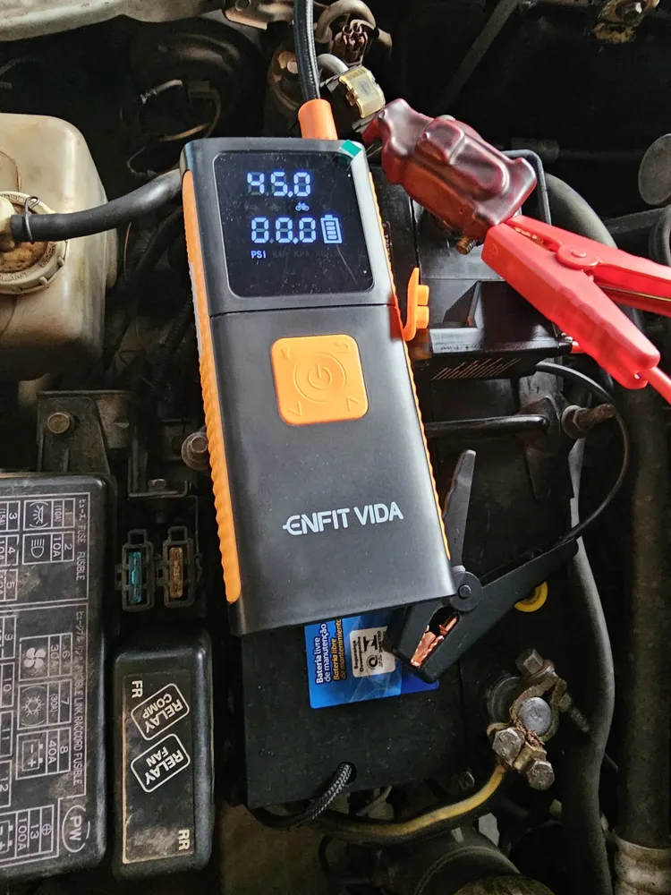 Equipamento portátil com várias funcionalidades. Todas funcionam muito bem, inclusive lanterna e sinalizador, alem do carregador usb. O estojo ja mostra a qualidade do produto. Vale a pena manter no carro, mas sempre verificando a carga da bateria, ao menos antes de viagens.